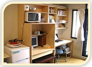 寮生個室は、6畳洋間が30室で、3階に14室、4階に16室あります。各室、備え付けの家具があり、机や椅子、テレビ台、本棚などは持ち込む必要はありません。部屋の反対側には、クローゼットとベットが備えられております。また、Wi-Fi環境が設備されており、インターネットを利用することができます。