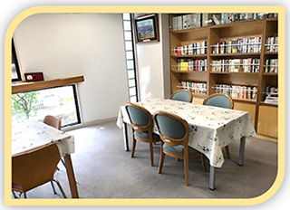 1階の読書・図書室です。普段は、寮生の自習室として使われています。試験の前になると、真剣に勉強する寮生の姿が見られます。